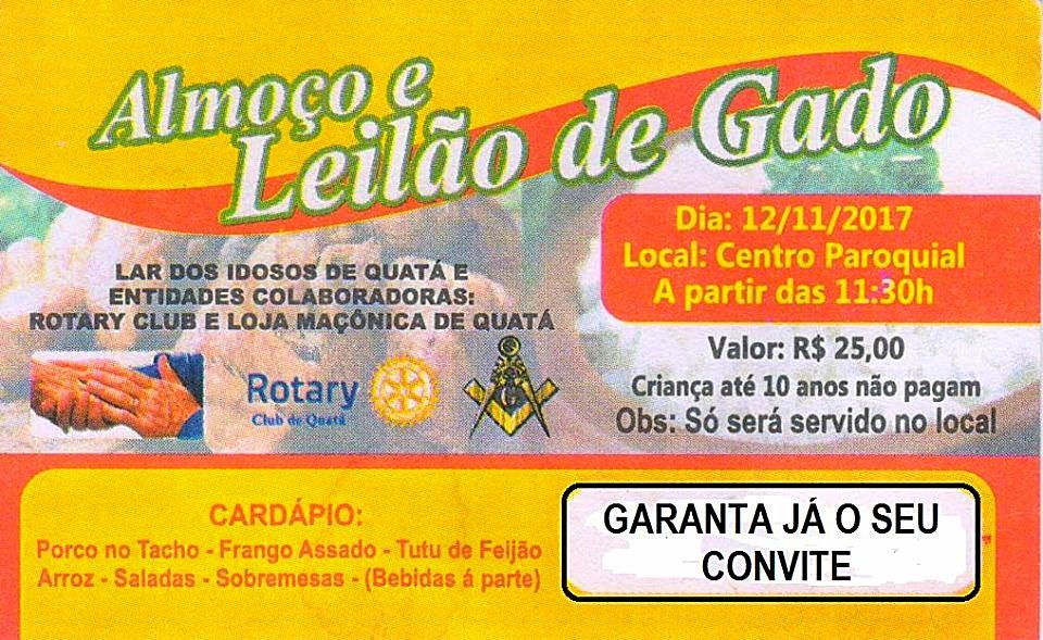 O Almoço e Leilão de Gado do Lar do Idoso de Quatá, será realizado no próximo dia 12 de novembro, no Centro Paroquial de Quatá. O Evento destinado a arrecadar recursos para concluir as novas instalações do Lar do Idoso de Quatá, tem a colaboração do Rotary Club de Quatá e da Loja Maçonica de Quatá. Os convites poderão ser aquiridos no Lar do Idoso de Quatá ou com os Rotarianos e Maçons de Quatá.